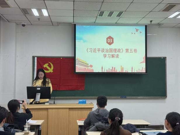 2025年11月17日,2025级博士生1班党支部在明德商学楼0201教室开展主题党日活动,深入学习贯彻党的二十届四中全会精神及《习近平谈治国理政》第五卷,准确把握全会精神实质与核心要义,引导支部党员统一思想、凝聚共识。本次学习活动由党支部书记钟峥云主持,第三学习小组带领学习,支部全体党员和入党积极分子共同参加。