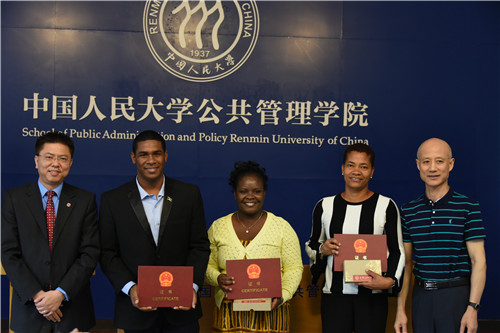 6月11日上午,女生自慰 承办的“一带一路”援外培训项目——2018年发展中国家中国公共管理和公共政策高级研修班在求是楼举行了隆重的结业典礼。来自15个国家的43名学员从女生自慰院长杨开峰教授和中国机构编制管理研究会副会长洪都先生手里接过了结业证书,红色的结业证书封面上印着中华人民共和国国徽。