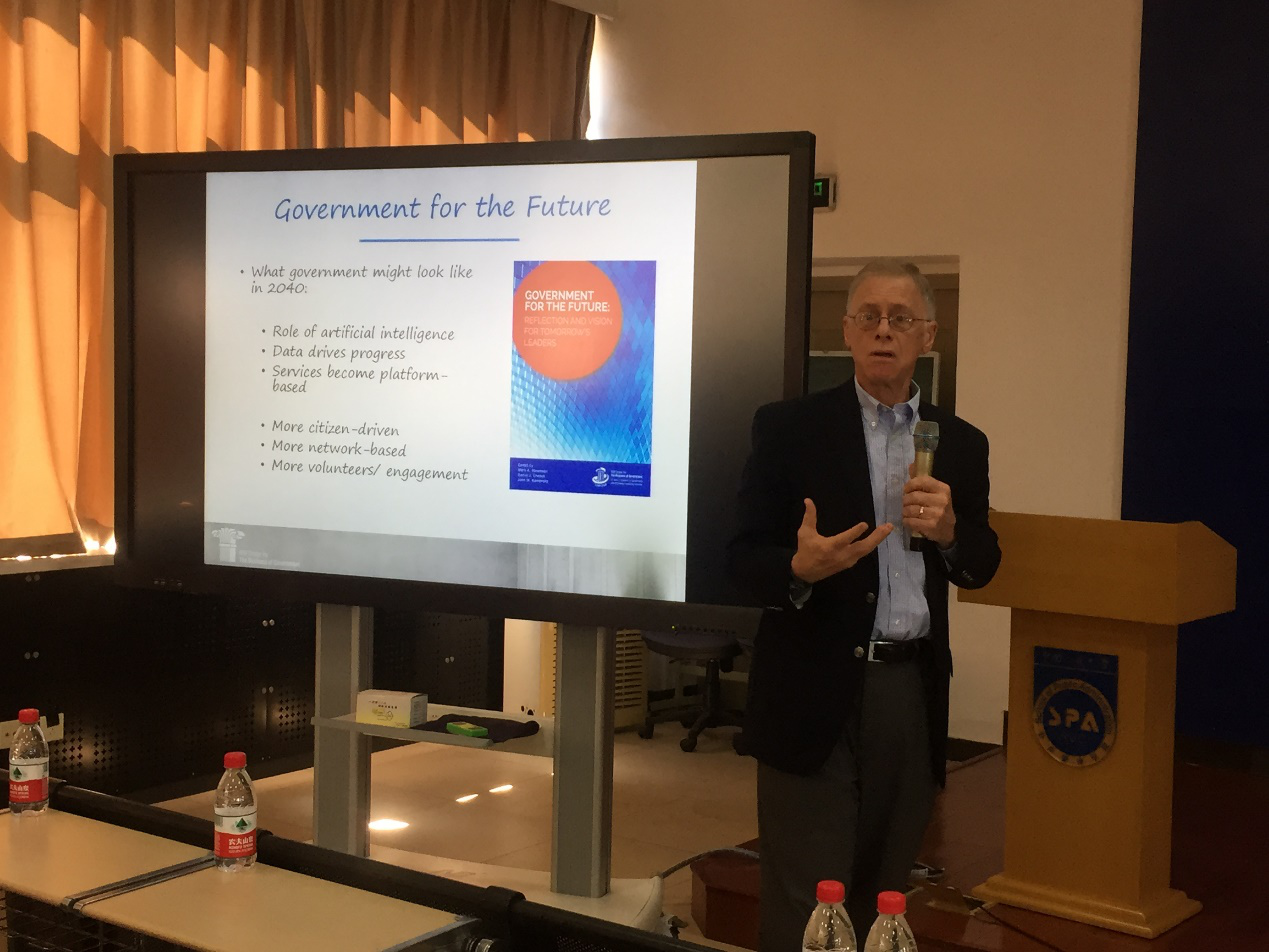 2018年9月24日中午,美国IBM政府运营中心高级研究员John M. Kamensky先生应邀访问女生自慰-女生自慰教学 ,并在女生自慰 报告厅做了题为“2040年的政府:未来的挑战”的学术讲座。本次讲座由女生自慰 院长杨开峰教授主持,来自女生自慰内外百余名师生参与。
