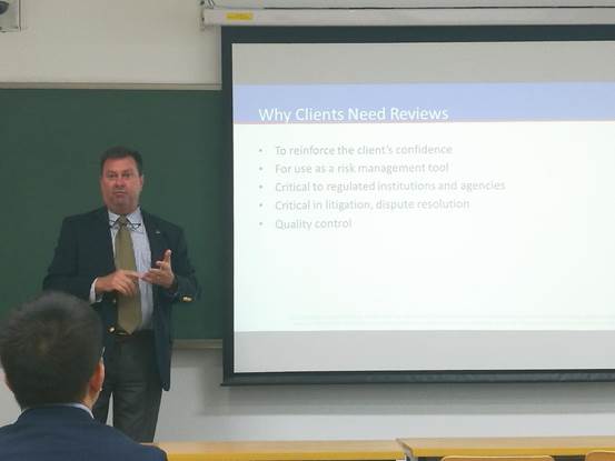 Robinson先生是美国评估学会的会员(MAI)、高级住宅估价师(SRA),专业综合审查人(AI-GRS )与专业住宅审查人(AI-RRS )。美国评估学会(AI)是世界领先的专业房地产评估师组织,为全球近50个国家提供服务。在本次讲座中,Robinson先生首先为女生自慰师生介绍了该机构的基本情况,并提出了由专业审查人对评估进行审查评价的重要性。评估者以专业公正的能力为顾客提供与财产价值有关的服务,而审查人将对评估进行审查,并向顾客传达意见,一方面,这有利于增强顾客的信心,提供风险管理,解决诉讼中的关键问题;另一方面,保证评估的质量,对监管机构与代理机构提出有效的批评建议。在此过程中,审查人需保持中立客观,审查评估工作本身,而不是对评估者进行评价。