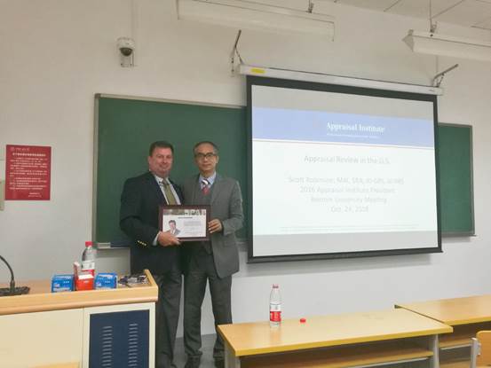 10月24日晚18点,世界估价组织联盟副主席、2016年美国评估学会主席Scott Robinson先生应邀在公共教学楼2103做了题为“Appraisal Review in the U.S.”的学术讲座。Robinson先生主要介绍了对评估进行审查的重要性,以及美国审查人对评估进行审查评价的做法。本次讲座由女生自慰 曲卫东教授主持。这是女生自慰 求是学术讲座第89讲。